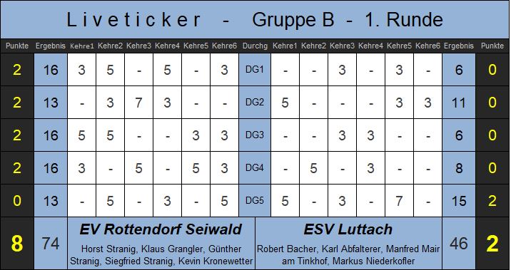Rottendorf überzeugte beim 8:2 Heimsieg mit einer kompakten Leistung, agierte treffsicher und zeigte den Zusehern auch einige „Schmankerln“ hoher Stocksportkunst. Der ESC Luttach hielt mit starker Leistung dagegen, versuchte immer im dran zu bleiben um das Spiel noch zu drehen, aber Rottendorf hatte an diesem Tag immer die richtige Antwort parat.