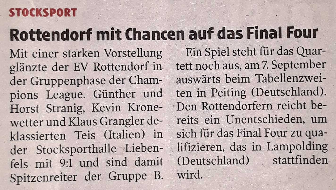 Überraschend deutlicher Sieg des EV Rottendorf in der 3. Runde der Champions League! In der Gruppe B schoss man Teis (It) in Liebenfels trotz erstzgeschwächter Truppe voll ab. Ohne die Asse Andi Spendier und Markus Wallner fuhren die Mannen von Coach Franz Stranig mit 9:1 über die Italiener drüber. "Das hat sich so keiner erwartet!", jubelte Stranig. Jetzt lacht Rottendorf sogar punktegleich mit Peiting von der Spitze, reicht im Auswärtsspiel bei den Deutschen am 7. September schon ein Punkt für das "Final Four"!