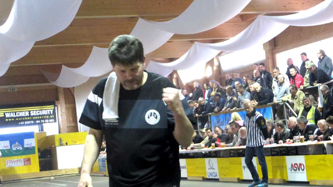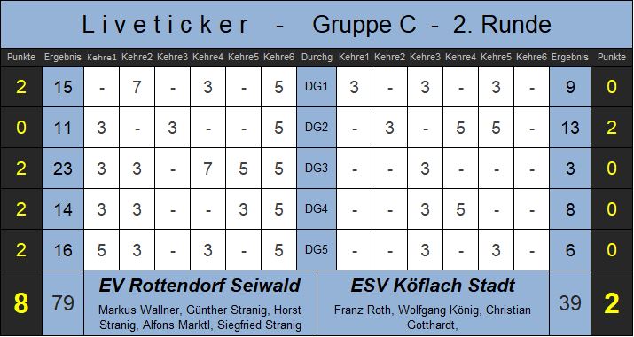 Rottendorf musste auf den ersten Stockspieler Andreas Spendier verzichten, bringt aber mit Günther Stranig einen Routinier in die Mannschaft. Köflach beginnt nervös, braucht zwei Kehren um in die Gänge zu kommen. Rottendorf hilft in der ersten Kehre kräftig mit und Köflach geht mit 3:0 in Führung. Aber dann ist Rottendorf im Spiel, holt mit einer 7 die zweite Kehre und gewinnt den nicht gerade hochklassigen ersten Durchgang. Aber nicht Rottendorf sondern Köflach wird stärker und gleicht zum 2:2 Pausenstand aus. Nach der Pause ist das steirische Team noch im "Schlafmodus", wacht erst nach der 3:23 Abfuhr auf. Köflach versucht mit einem Spielerwechsel das Spiel noch zu drehen und diese personelle Maßnahme schien sich schon auszuzahlen. Aber in der letzten Kehre des 4. Durchgangs, beim Stand von 9:8 für Rottendorf und Nachspiel für Köflach, unterlief dem steirischen Team der entscheidende Fehlversuch.