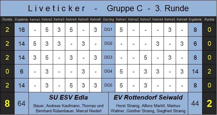 Im Spitzenspiel der Runde montierten die Steirer Rottendorf im wahrsten Sinne des Wortes ab - nach drei Spielen war die Partie entschieden, erst im 4. Durchgang konnte Rottendorf punkten. Im letzten Druchgang gab es noch zwei Punkte obendrauf. In Kärnten wird man in den beiden nächsten Wochen viel an Taktik arbeiten, um Edla im Heimspiel besiegen zu können. Alle vier Spieler des Siegers in Topform, die Kärntner agierten mit zu vielen Fehlern. 300 begeistere Zuschauer, auch aus Rottendorf war ein Bus mit dabei. Tolle Parie, und Rottendorf ist noch lange nicht durch.