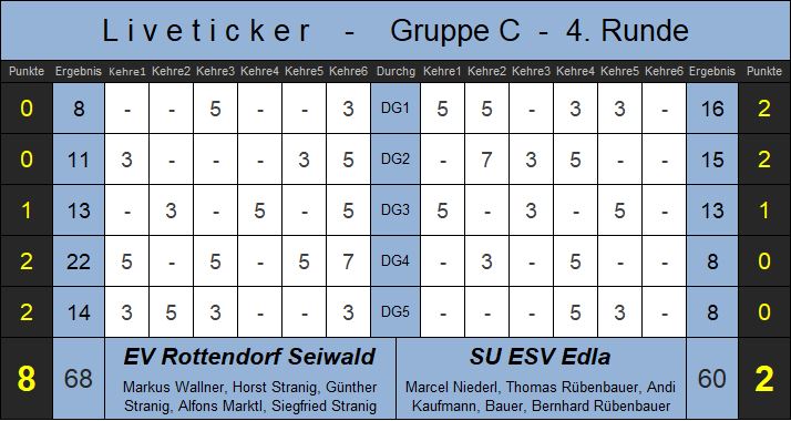 Vor 14 Tagen gab es im Hinspiel für die Kärntner nichts zu holen, aber im Heimspiel war das Team auf Wiedergutmachung aus – aber, wieder gut machte es Edla. Die Südoststeirer spielten vor einer tollen Kulisse unbeeindruckt ihr „Ding“ herunter und Rottendorf kam von Anfang an nicht ins Spiel. Der Pausenstand von 0:4 ließ nicht mehr viel Hoffnung für Rottendorf. Aber nach der Pause wehrten sich die Tiebelstädter gemeinsam mit den Fans gegen die drohende Niederlage. In der letzten Kehre kommt Edla ins Straucheln und verspielt den 5er-Vorsprung, denn Rottendorf hat sogar die Chance auf eine 7, schafft aber mit dem letzten Versuch noch das Unentschieden.