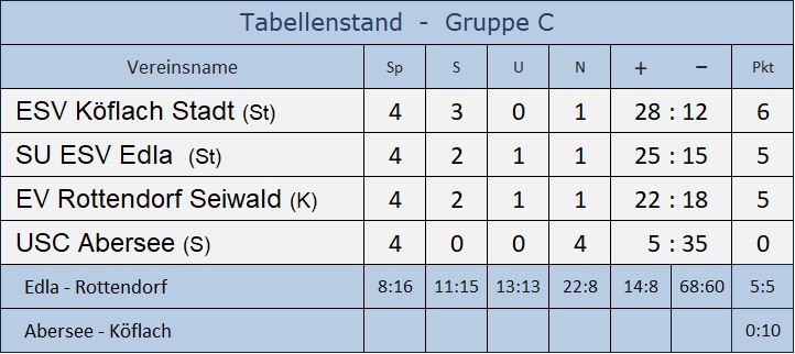 Der ESV Edla begann überfallsartig und drängte die Rottendorfer in die Defensive, erst im dritten Durchgang gelang dem EV Rottendorf der erste Punkt. Doch am Ende kämpften sich die Hausherren zurück ins Spiel und retteten noch ein Remis 5 (68) : 5 (60). Rottendorf ist weiterhin Dritter und muss am 10.Juni in Köflach punkten, um die Chance auf die Play-offs zu wahren. Bis dahin wird auch hoffentlich Andi Spendier nach seiner Blinddarm-Operation zurück sein.
