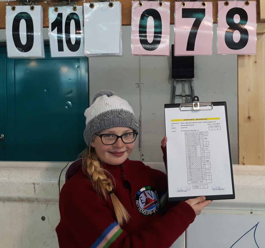 Rottendorf jüngste Spielerin sammelt mit ihren 10 Jahren weiter fleißig Erfahrung im Eis- und Stocksport. Bei der Premiere auf Eis zeigte sie bereits sehenswerte Versuche und schaffte mit 78 Punkten eine persönliche Bestleistung. Am Ende reichte es in der erstmals durchgeführten weiblichen U14-Spielklasse zum 7. Platz.