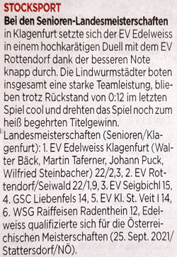 Rottendorf startete erstmals in der Vereinsgeschichte bei einer Senioren Landesmeisterschaft. Dabei zeigten die Oldies ihre derzeit gute Form und wehrten bis zur siebenten Spielrunde alle Angriffe ihrer Gegner ab. Im Duell der Ungeschlagenen spielten Rottendorf und Edelweiß Klagenfurt um die Vorentscheidung bei dieser Meisterschaft. Dabei entwickelte sich ein Spiel auf hohem Niveau bei dem die Tiebelstädter in der vierten Kehre den Big-Point ausließen und am Ende gegen Klagenfurt mit 8:14 die Segel streichen mussten. Drei Spiele vor Schluss bekam auch Klagenfurt gegen EV Klein St. Veit den Geschmack der Niederlage zu spüren, so dass im Duell der „fast Unbesiegten“ die Quote über den Meistertitel entscheiden musste.