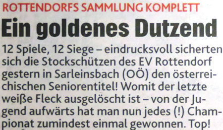 Rottendorf legte bei der ÖM-Ü50 in Sarleinsbach (O) motiviert los und tankte gleich im ersten Spiel gegen den Titelverteidiger, EV Edelweiß Klagenfurt (K), mit dem 18:6 Sieg viel Selbstvertrauen. Rottendorf beeindruckte in der Folge mit seiner Treffsicherheit und mannschaftlichen Geschlossenheit und ließ seinen Gegnern wenig Spielraum um sich zu entfalten. Auch wenn im Finish der Meisterschaft mit Geretsberg (S) und Hörbranz (V) zwei Teams näher dran waren die weiße Weste von Rottendorf auszuziehen, ließ sich der Tiebelstadt-Express auf dem Weg zum Sieg in der „Oldie-Liga“ nicht aufhalten, und holte mit dem Punktemaximum seinen ersten Titel in dieser Spielklasse.