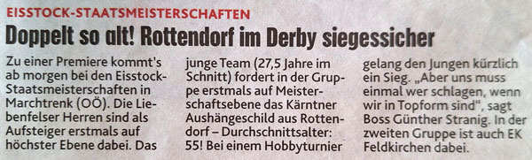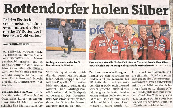 FELDKIRCHEN, MARCHTRENK. Mit den 82. Herren Staatsmeisterschaften im Mannschaftsspiel werden in der Eishalle Marchtrenk am Wochenende die letzten Staatsmeisterschafts-Medaillen vergeben. Klein aber fein ist die Halle in Marchtrenk und wie jedes Jahr lockt die “Königsdisziplin” des Eisstocksports viele Fans nach Oberösterreich. Rottendorf und Feldkirchen mit dabei