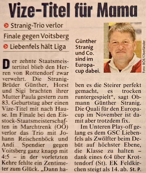 In Marchtrenk (OÖ) erspielte sich Rottendorf in der Vorrunde mit dem Punktemaximum die optimale Voraussetzung für den Finaltag. Die Tiebelstädter beendeten auch die Meister-PlayOff an erster Stelle und setzten sich in einem absoluten Spitzenspiel nach fehlerlosem Spiel mit 4:3 gegen Union Wang (NÖ) durch. Im Finale waren die einzelnen Kehren heiß umkämpft, ehe sich Rottendorf dem ESV Voitsberg (ST) knapp mit 4:5 geschlagen geben musste. Das tat der Freude über einen weiteren großen Erfolg in der langen Karriere der Spieler keinen Abbruch.